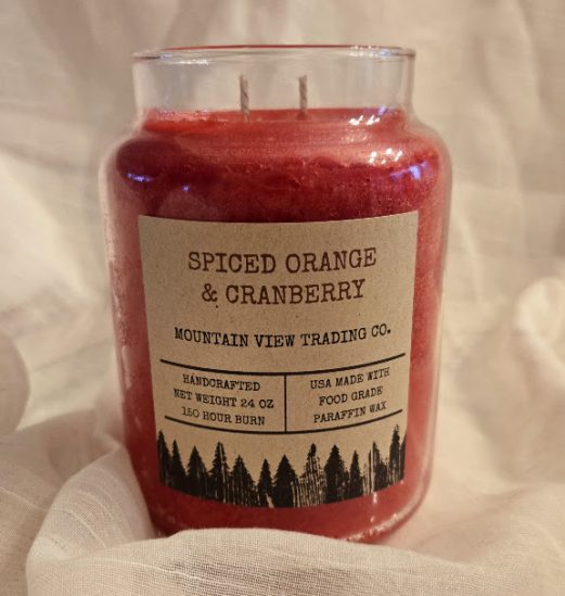 Country style glass jar and glass lid. 24 oz of 100% food grade paraffin wax. 2 wicks, Smells of Cranberry, sweet orange, cinnamon, and clove.